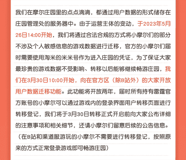 合作结束本就是开发方和代理方双方的事情,,,降低这件事情对玩家的影响,,,才是对所有珍视这段童年的摩尔玩家最好的呵护。。目前看来,,,,用户完全不用担心后续因无法登录游戏而造成任何数据上的损失,,只要及时进行账号转移,,,,就可以好好保留、、延续在庄园的痕迹和回忆,,,继续在庄园里做快乐的红鼻子小鼹鼠。。。