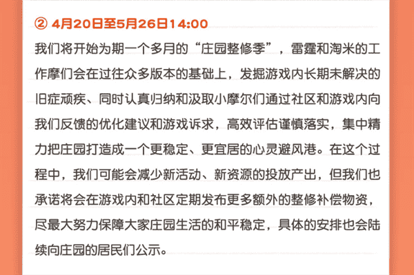 合作的结束并不意味着这个童年IP的结束,,,,对于《摩尔庄园》手游而言,,,这是一个新阶段的开始。。。。后续游戏内将开启庄园重构计划,,,会就以往遗留下来的BUG进行集中修复,,,并在游戏内和社区定期发布更多补偿物资。。。