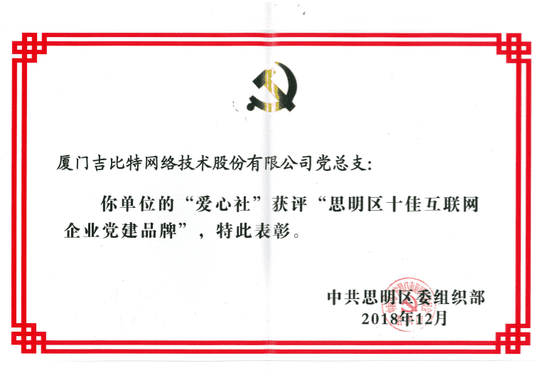 经初审评选、、网络评选和专家评审等环节,,,,"厦门yaxin111网络技术股份有限公司党总支-爱心社" 从全区28个参评党建品牌中脱颖而出,,,,获评"思明区十佳互联网企业党建品牌"。。