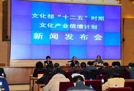 2月28日下午,,文化部在京召开新闻发布会,,,,正式向社会发布《文化部“十二五”时期文化产业倍增计划》,,,,提出了 “十二五”期间文化部门管理的文化产业增加值年平均现价增长速度高于20%,,2015年比2010年至少翻一番,,,,实现倍增的奋斗目标。。